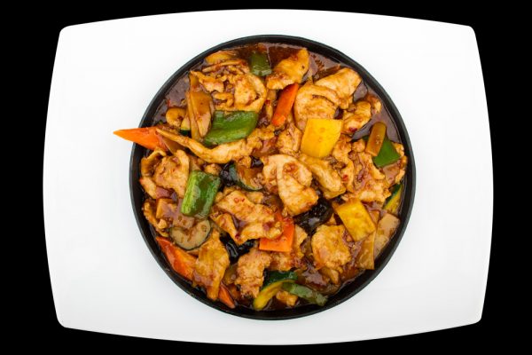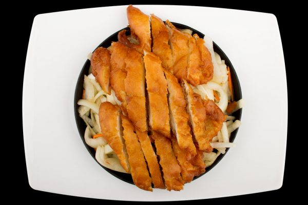 Knuspriges Hühnerfleisch mit Zwiebel, Sojabohnensprossen, Karotten und Knoblauch-Sauce A/C